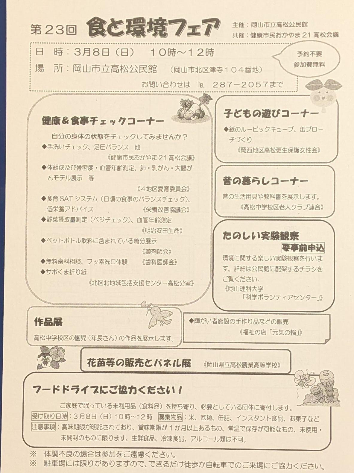 岡山市北区高松公民館で開催された「第23回食と環境フェア」に参加しました。